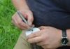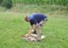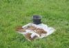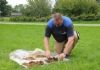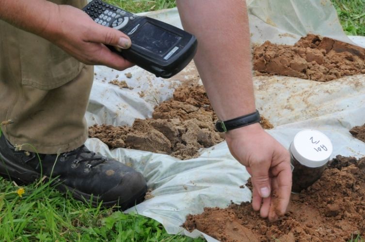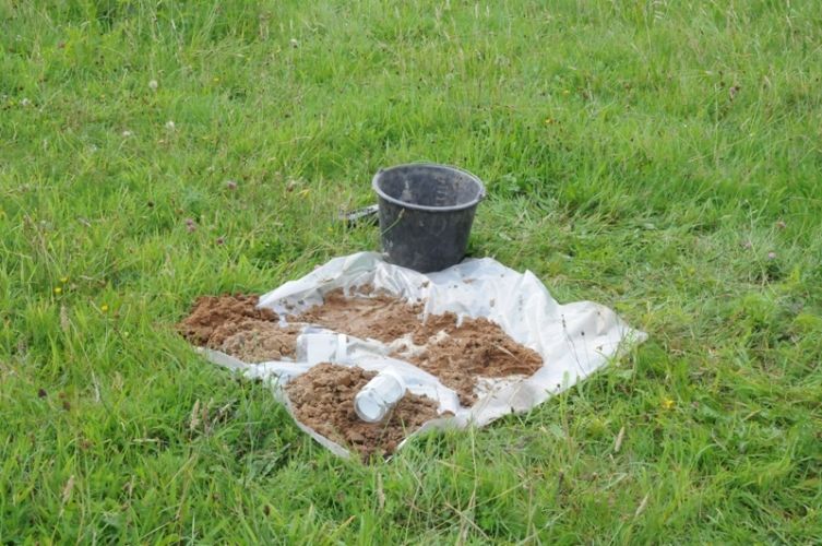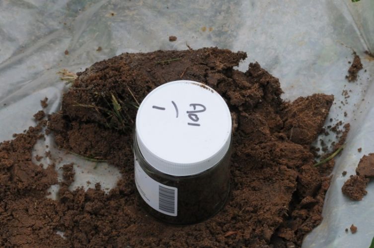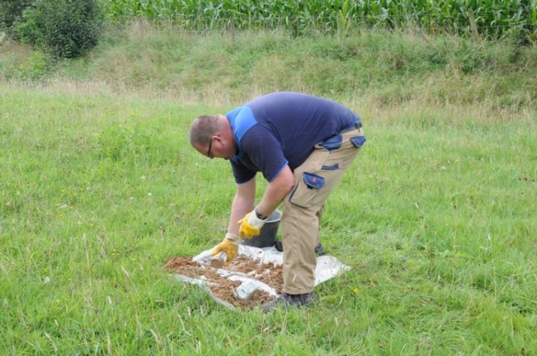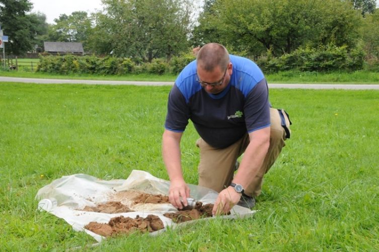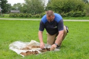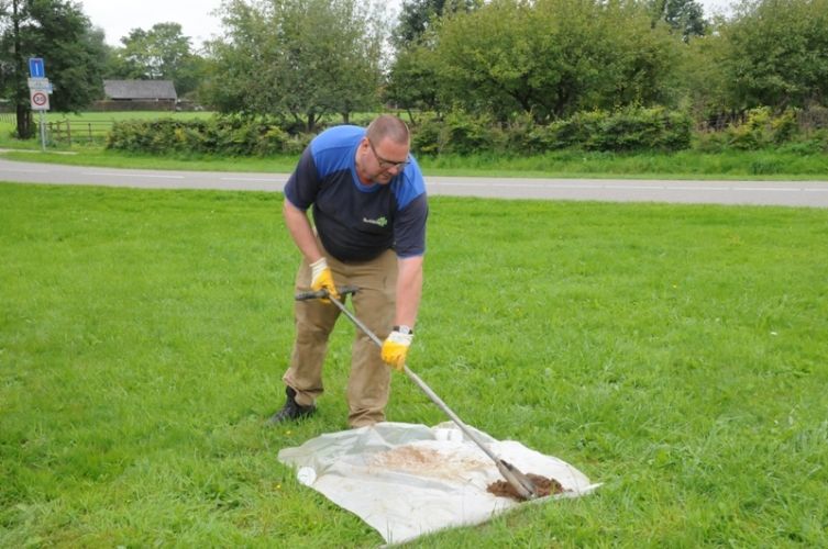 Rondeel maakt met een eenvoudige grondboor bodemprofielen. Deze stalt hij netjes voor zich op een plastic zeiltje en neemt vervolgens op de verschillende dieptes monsters.