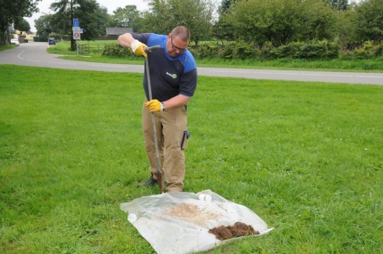 Arthur Rondeel van het bedrijf Econsultancy is bezig met het verzamelen van grondmonsters op het toekomstig tracé van een nieuw riool in Doetinchem.