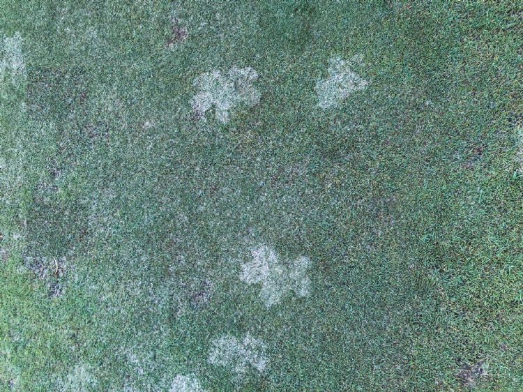Onze vraag was: wat is er gebeurd op deze green? Het antwoord van Gerard zelf luidt als volgt: 'De green is bezand en tijdens de regen werd het zand afgedekt door recent gevallen blad, waardoor het zand niet weggespoeld (ingeregend) werd.' Het gevolg is dat er hoopjes zand op de green liggen in de vorm van het blad.