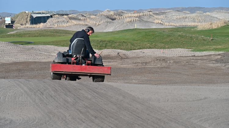 Ik loop met Pelgrum naar het nieuwe par-3-oefenbaantje dat wordt aangelegd. Daar is goed te zien hoe de mannen van De Ridder werken. Pelgrum legt kort en bondig uit: 'Eerst wordt de baan geshaped met een kraan door shapers Martin Overvest en Richard Castle en Texelaar Jacco Veeger. Daarnaast worden de laatste oneffenheden gladgestreken met een bunkerrake en kan er gezaaid worden. De greens worden ingezaaid met een mengsel van roodzwenk en struis. Het roodzwenk wordt allereerst wat dieper weggelegd met een schijvenzaaier. Daarna wordt het struis gewoon met een handzaaier opgebracht. Vervolgens wordt het zaad vastgelegd door het terrein met een bunkerhark af te rijden. Daarbij ontstaat een mooi geblokt patroon, waardoor je het jonge gras al snel ziet opkomen.'