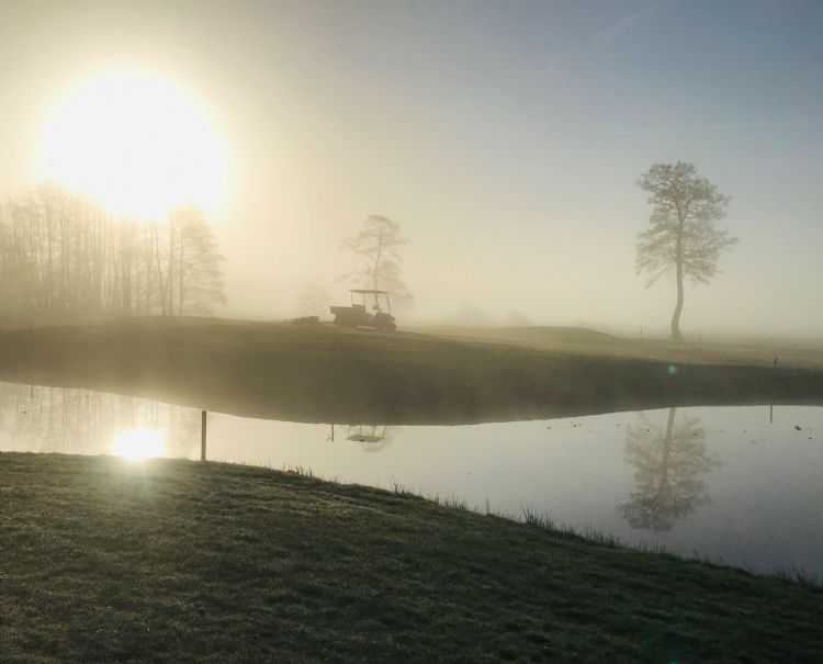 Greenkeepers zijn vaak echte ochtendmensen. De werkdag begint immers vroeg. Deze foto is dan ook op een zondagochtend genomen door greenkeeper Andries Looijenga. Zijn karretje fungeert als decorstuk in deze landschapsfoto bij hole 4 van Golfbaan Lauswolt in Friesland.