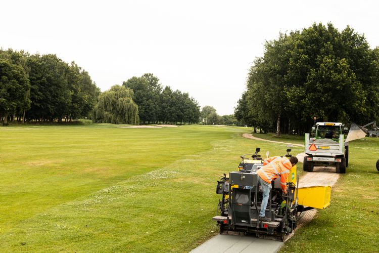 Golfbaan Heelsum vroeg VDBH de bestaande padenstructuur te upgraden en een aantal nieuwe tracés aan te leggen. In totaal ging het om 6000 m2. 'Hierbij trokken we samen op met De Beijer uit Dodewaard. De paden die er lagen, waren gemaakt van verschillende materialen. Een deel van de paden was al van Graustabiel; dat was ook het materiaal waarmee wij verder gingen voor de reconstructie van de oudere paden en de aanleg van de nieuwe. Bij renovatie hergebruiken we alles. De bestaande halfverharding ruwen we op of rippen of frezen we, afhankelijk van het materiaal dat er al ligt, gebonden of ongebonden. Vervolgens wordt er profiel aangebracht en verdicht en gaat de nieuwe toplaag erop. Het losmaken is heel belangrijk voor de hechting van de toplaag', legt Stufken uit. De golfclub wilde zo min mogelijk onderhoud en zo min mogelijk los granulair materiaal op het pad, om de maaimachines te beschermen. 'Voor golfbanen is het belangrijk om zo min mogelijk los materiaal te hebben; korreltjes in het gras kunnen behoorlijke schade aanrichten aan de maaimachines. Maar met Graustabiel is daar amper sprake van.' Na de aanleg blijft VDBH op het terrein in Heelsum verantwoordelijk voor het onderhoud van 81.000 m2. Met twee nieuwe opdrachtgevers lijkt VDBH voet aan de grond te krijgen in de golfwereld.