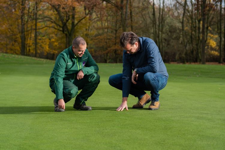 De tetraploïde Engelse raaigrasrassen bleken in de praktijk dus super droogteresistent. Ook op de plekken op de fairway die te leiden hadden gehad van het brakke water, bleek het Masterline-sportveldmengsel 4-4-2 Master GM wonderen te verrichten. De zouttolerantie van de gebruikte rassen in dit mengsel is namelijk ook vrij hoog. Het aardige, vind ik, is dat de semi-rough met dezelfde grassamenstelling behoorlijk donkerder kleurt door het wat hogere maaien. Dat geeft een mooi contrast, meer dan wat je bij andere, monopoloïde, rassen ziet. Overigens zijn de rassen in het 4turf-mengsel bij DLF ook separaat beschikbaar, zodat men zelf een rassenmix, indien voorradig, kan samenstellen in het 4turf-mengsel. Juist dit maakt het voor een eindgebruiker mogelijk om te wisselen van rassen.'