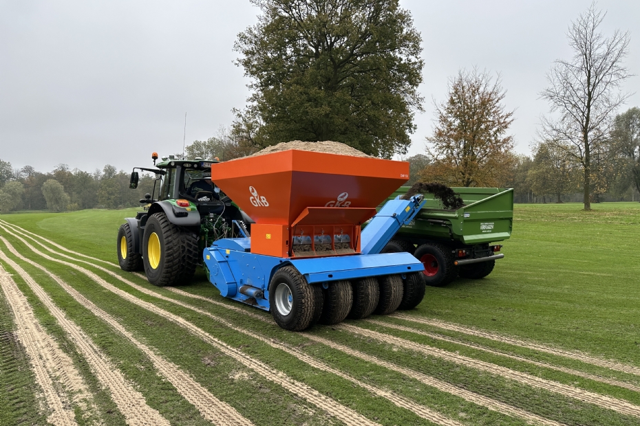 Het aanleggen van een drainagesysteem op een golfbaan is een specialisme op zich, vertelt Leo Poldervaart: 'Je hebt te maken met hoogteverschillen waarmee je bij het ontwerpen van je drainagesysteem rekening moet houden. Op Landgoed Bergvliet trokken we eerst met onze drainagemachine sleuven om het slangensysteem aan te leggen. Voor het topdrainen gebruikten we de Drainmaster, omdat je daarmee niet de hele toplaag hoeft te verwijderen. De machine creëert lamellen van 25 centimeter diep en 4 centimeter breed, waardoor je een behoorlijke afwatering hebt. Dit systeem passen we gefaseerd toe op de fairways en de foregreens. Het is een omvangrijke operatie, want naast de Drainmaster zetten we twee zandvulkarren, twee kiepwagens en een kraan in om het zand te laden.' De twee extra vulwagens zijn essentieel, omdat de zandbunker van de Drainmaster zelf maar zo'n 100 meter kan vullen.