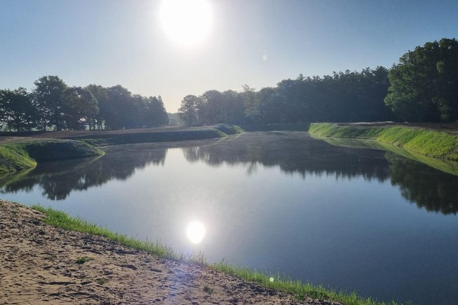 Voor het project op zich had het schrappen van de ondergrondse wateropvang geen gevolgen. Toen de andere nieuwe voorzieningen voor waterbeheer gereed waren, bleef het wekenlang droog en kon er dus ook bovengronds geen water opgevangen worden. 'Zo extreem hadden we het niet verwacht. We mochten wel wat water oppompen, maar er was veel meer nodig. De bestaande waterbron op het terrein raakte ook nog eens beschadigd tijdens de werkzaamheden en moest opnieuw geslagen worden. De voorjaarsdroogte werkte helaas extra vertragend; daardoor moest het inzaaien van de fairways uitgesteld worden van mei tot juni. Uiteindelijk zal het allemaal wel goed komen; de poelen en vijvers zullen zich vullen en de baan kan gewoon open in oktober, al zal er dan nog geen dikke grasmat liggen.'