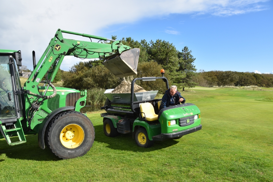Uiteraard vraagt ook de beheersing van de viltlaag op de Texelse greens om blijvende aandacht. 'We hebben de dikte van de viltlaag, zowel op de oude greens van 2017 als op die van daarna, nu behoorlijk onder de knie', verklaart Witte. 'Dit hebben we onder meer te danken aan frequent beluchten en bezanden. We prikken de greens bijna wekelijks met de dunne massieve spike-beluchters aan onze triple-maaier. Met het oog op efficiëntie en de golfende gasten werken we in een treintje. Dus achtereenvolgens prikken, dan bezanden en vervolgens invegen met een borstel. Dankzij een goede afstemming kunnen we zo de greens van de twee keer 9 holes in twee uur bewerken, nog voor de ochtendpauze! Daarbij brengen we met onze John Deere 6120-tractor met voorlader steeds een volle bak zand naar de topdresser waarmee we op de greens bezig zijn.'