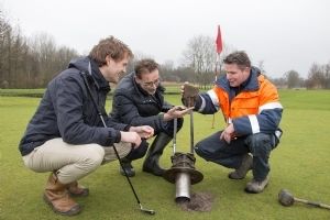 Foto v.l.n.r.: NGF-agronoom Niels Dokkuma, directeur-generaal Chris Kuijpers en Leen van Reeuwijk, hoofdgreenkeeper van Golfclub Zeegersloot, bekijken de wortelgroei op een van de greens die inmiddels volgens de Green Deal-afspraken met 'natuureigen’ middelen is behandeld tegen onkruiden en schimmels.