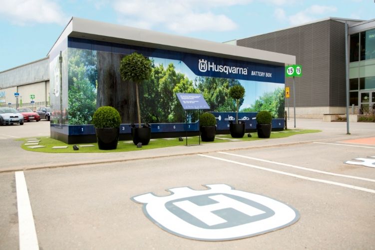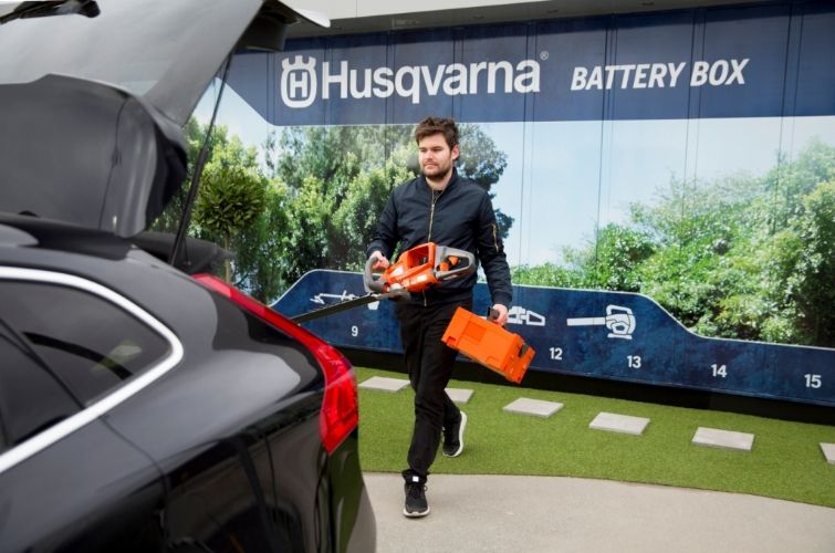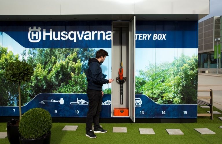 De accugereedschappen zijn voor 35 euro per dag te huur bij de zogenoemde Husqvarna Battery Box. De Husqvarna Battery Box, een onbemande mini-loods, bevat dertig kluizen met heggenscharen, kettingzagen, bladblazers en grastrimmers op accu. Via een app op je smartphone of tablet kun je één of meerdere apparaten reserveren en ophalen.