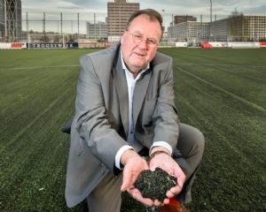 Een gure maandagochtend in Amsterdam, anderhalve week later. In de tussentijd is er over en weer wat gesteggeld over de interviewlocatie. Zembla wilde dolgraag een achtergrond van stapels autobanden. Wij vertikten dit natuurlijk: het gaat over rubberkorrels op kunstgras, niet over autobanden in een verwerkingsfabriek. Het compromis was: een voetbalclub. De avond voor de opname bleek dit opeens onmogelijk – het werd een studio ergens op het Java-eiland in Amsterdam. Onze man die het woord ging voeren: Frank Hopstaken. Als chemisch geoloog bestudeert hij al 35 jaar de verspreiding van stoffen in de bodem en hij is vanaf het begin betrokken bij het gebruik van rubbergranulaat op kunstgras. Zelf is hij overigens een fervent voetballer en voorzitter van een grote club in het westen van het land. Zoals hij altijd zegt: ‘Ik voetbal heerlijk op kunstgras, mijn passes komen altijd aan.’ Frank is een absolute topdeskundige op het vlak van rubber, de circulaire economie, de samenstelling van de korrels en de impact ervan op de bodem. Maar hij is wel van ons. Dus verdacht, in de ogen van Zembla. We hadden graag een volledig onafhankelijke expert naar voren geschoven, maar die mogen niet meer praten over dit onderwerp van hun werkgever. Te gevoelig. Of Zembla blijkt ze al te hebben gesproken en heeft ze een spreekverbod tot na de uitzending opgelegd. Interessante vorm van objectieve journalistiek, zeg maar.