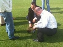 aat' opdracht gekregen voor het ontwerp en de bouwbegeleiding van het stadionveld van Fenerbahçe Sport in Istanbul. Het veld van deze club heeft het afgelopen jaar veel kritiek gehad onder andere door wateroverlast en instabiliteit van de toplaag. Rob de Heer mag nu via zijn bedrijf Sports Pitch Engineering in samenwerking met Aad van Wijk een ontwerp maken voor de reconstructie van het bodemprofiel en implementatie van een beregeningssysteem en veldverwarming. Vanaf 20 mei zal de reconstructie plaats vinden. De rol van Van Wijk en De Heer betreft kwaliteitscontrole en bouwbegeleiding. Fenerbahçe investeert op dit moment in haar velden mede gelet op de potentiële toewijzing later deze maand voor Turkije als gastland van het EURO 2016 toernooi. Op de foto de 'head groundsman' van het Fenerbahçe Stadion tijdens een bezoek aan Nederland.