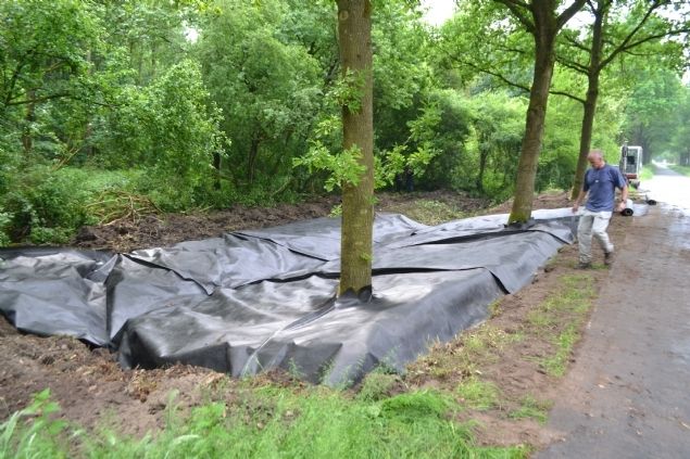 Uitdaging in het aanbrengen van het doek zijn plekken rondom bomen, waar het lastig is het doek mooi “duizendknoopdicht” te maken. Om het doek zo goed mogelijk om de boom te leggen, krijgt deze een soort rubberen kraag (nog niet te zien op de foto). Als de plant nog ergens opduikt, dan zal het op deze plekken zijn vertelt Zweers. Maar als er een enkele keer een stengel opduikt, is dat niet zo’n probleem, die kan de aannemer in zijn rondgang wel weghalen en veilig afvoeren.