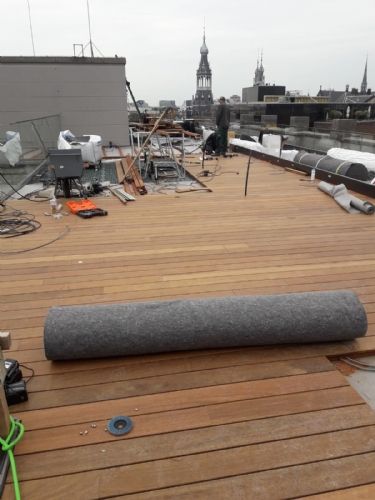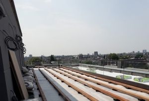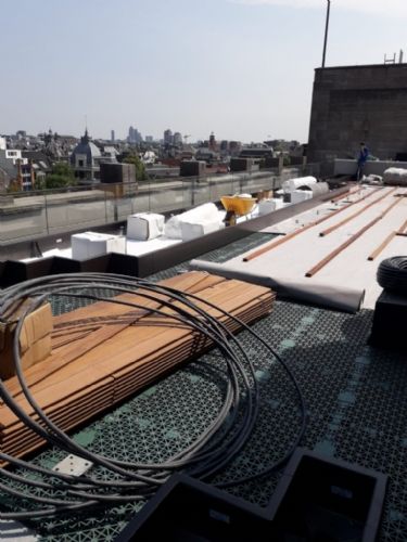 Strakke planning De uitvoering van deze speciale daktuin kent een logistieke uitdaging. Het pand ligt namelijk aan de Spuistraat in Amsterdam, op een steenworpafstand van de Dam. Er is nagenoeg geen depotruimte. De materialen moeten vanaf de straat het dak op gehesen worden. Daarvoor moeten vergunningen geregeld worden en de weg afgesloten worden. Een goede planning is met het drukke verkeer in de Amsterdamse binnenstad dus een absolute noodzaak.