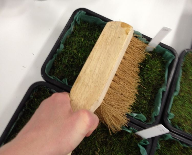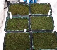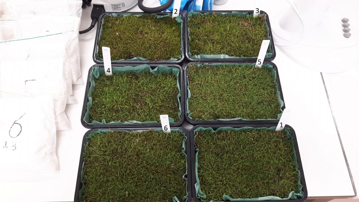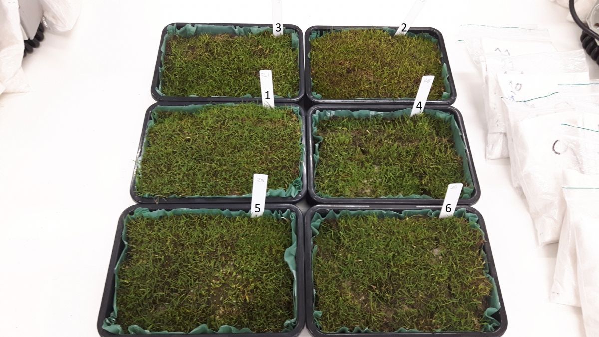 In het klimaatkastexperiment werden dezelfde middelen en methoden op kleinere schaal getoetst, op grasmonsters waarvan bekend was dat er sneeuwschimmel in de bodem aanwezig was. Het sweepen werd gedaan met een handbezem, het droogrollen met een deegroller. Tafelventilatoren werden ingezet als vervanger voor de reuzenventilatoren in het veldexperiment. De temperatuur en luchtvochtigheid van de klimaatkast waren zó ingesteld dat de ontwikkeling van sneeuwschimmel werd gestimuleerd. De grasmatjes werden wekelijks geknipt en het knipsel werd niet verwijderd. Tekst loopt door onder de afbeelding