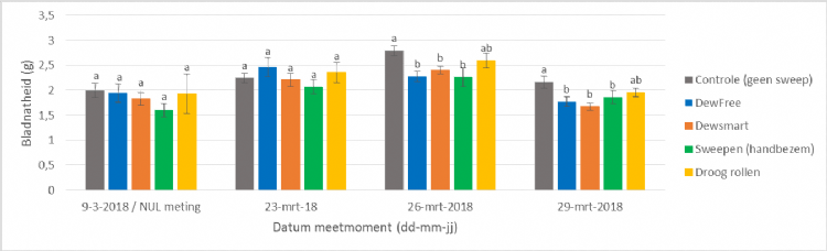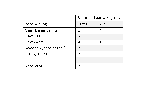 De behandelingen Dewfree, Dewsmart en sweepen resulteerden in een significant lagere bladnatheid dan op de onbehandelde testvelden van het veldexperiment. De methode sweepen verwijdert dauw, maar verspreidt waarschijnlijk ook schimmeldraden. De middelen Dewfree (PTS) en Dewsmart (H2Pro) bestaan uit verschillende niet-ionische surfactants (uitvloeiers), die de oppervlaktespanning van water verminderen. Hierdoor verspreiden waterdruppels zich meer over het blad en kan het water sneller verdampen.