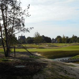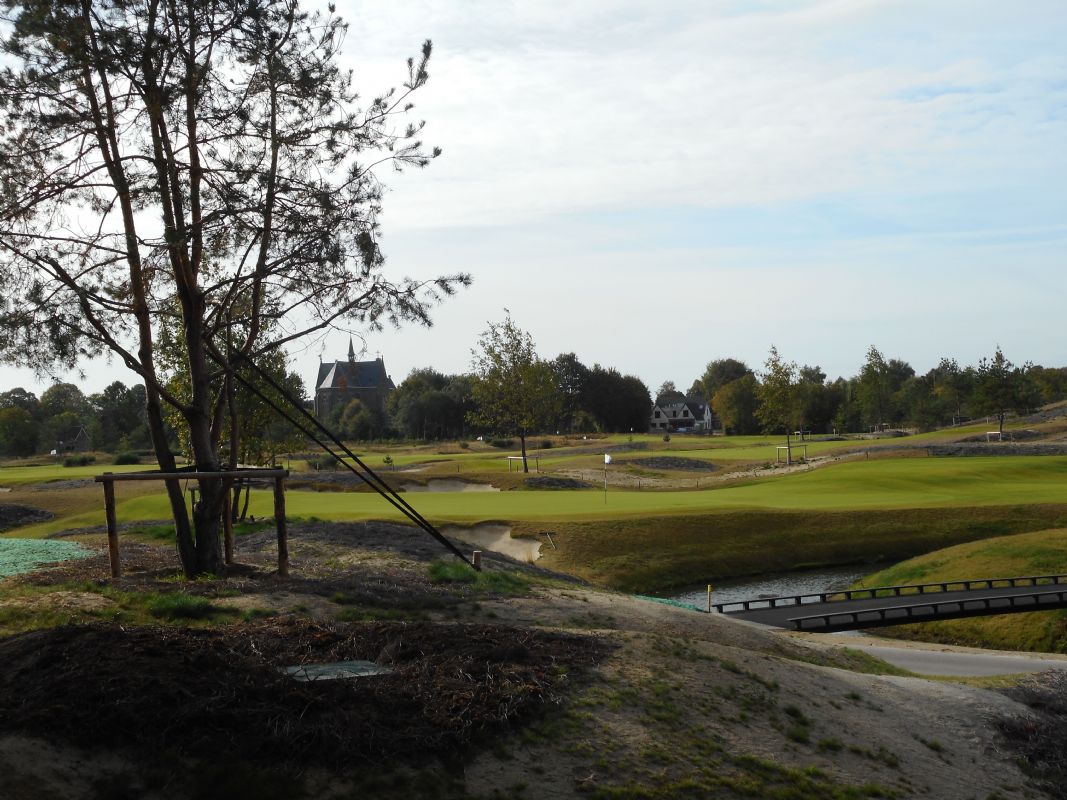 Het grote verschil met de andere nieuwe Nederlandse baan waar superintendent Richardson voorheen werkte, The Dutch, is dat Bernardus in een fraai bestaand landschap is aangelegd. De golfbaan wordt omgrensd door bos en het dorpje Cromvoirt, de 18de hole speelt richting de kerk van het Brabantse plaatsje. Er loopt ook een oud bomenlaantje door de baan, een wandelpad. Bernardus oogt daardoor nu al oud, ook al is alles net aangelegd en gloednieuw. ‘Alleen bij de tees voelt de baan nog wat nieuw en kunstmatig’, zegt de mystery guest. ‘De tees zijn prachtig vlak en hard, ze zijn niet zichtbaar verhoogd en ze lopen mooi over in de directe omgeving. Maar de bultjes met heide en gaspeldoorn bij de graspaden naar de afslagplaatsen zijn nu nog zo gemanicuurd dat ze een beetje doen denken aan een plantsoen.’
