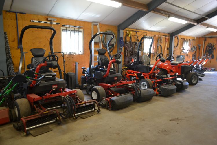 We zien veel oranje in de greenkeepersloods, maar ook twee Toro Greensmaster 3250.