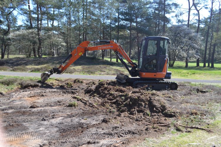 Niet alleen de fairways hadden flink te lijden onder de droogte van vorige zomer, ook de heide op De Pan is aangetast. Heide zie je vrijwel overal tussen de holes op de golfbaan. Vorig jaar lag de heide er rond deze tijd van het jaar nog prachtig bij, maar toen volgde de droogte. 'Nu is ongeveer de helft dood', vertelt Lampe. 'Heide kun je helaas lastig water geven, waardoor er veel verloren gegaan is. We kiezen er nu voor om de dode heide af te plaggen en af te voeren. Er zit nog genoeg zaad in de grond, want dat gaat zo veertig jaar mee. Met wat geduld groeit de heide dus vanzelf weer terug, maar dat gaat wel twee à drie jaar duren.' De afgegraven grond wordt gecomposteerd. Uiteindelijk krijgt De Pan de grond weer terug voor hergebruik in het terrein.