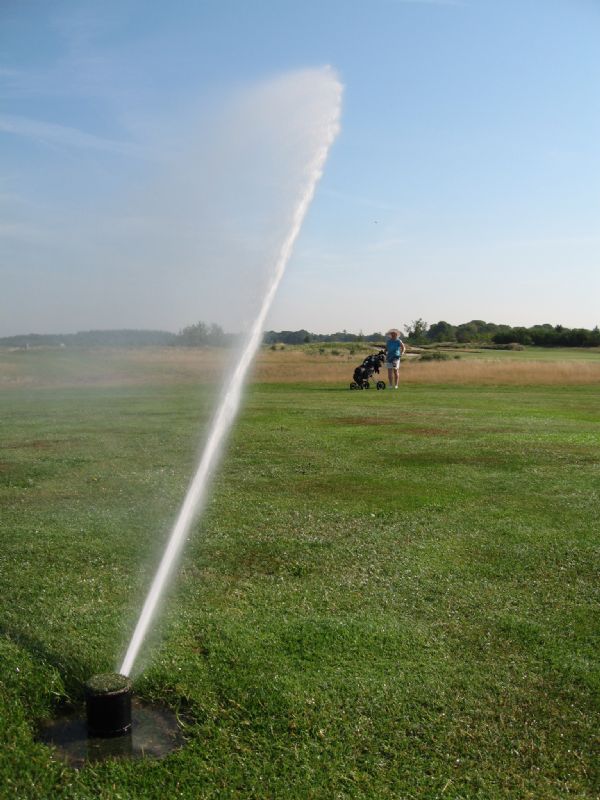 'Waterbesparing is een thema dat samenvalt met die precisieberegening die ik noemde. Beregen waar het nodig is, niet waar droogte geen kwaad kan. Dat heeft zoals gezegd met waterbesparing te maken, maar ook met minder maaien. Daarnaast is het gebruik van de beregeningsinstallatie ook nog van belang: er zijn greenkeepers die de installatie goed gebruiken, maar er zijn er ook die hem alleen maar aan- en uitzetten. Onze taak als beregeningsbedrijf is om op basis van de behoefte van de greenkeeper een bepaald aantal millimeters water op het gras aan te brengen, in combinatie met de hoeveelheid tijd die daarvoor beschikbaar is. De installatie draait dan een uur of zes, ook op de fairway. Wil je korter, dan moet je een zwaardere bom nemen of dikkere leidingen. Het aanleggen is ons werk; het gebruik van de installatie is aan de greenkeeper.'