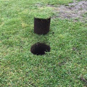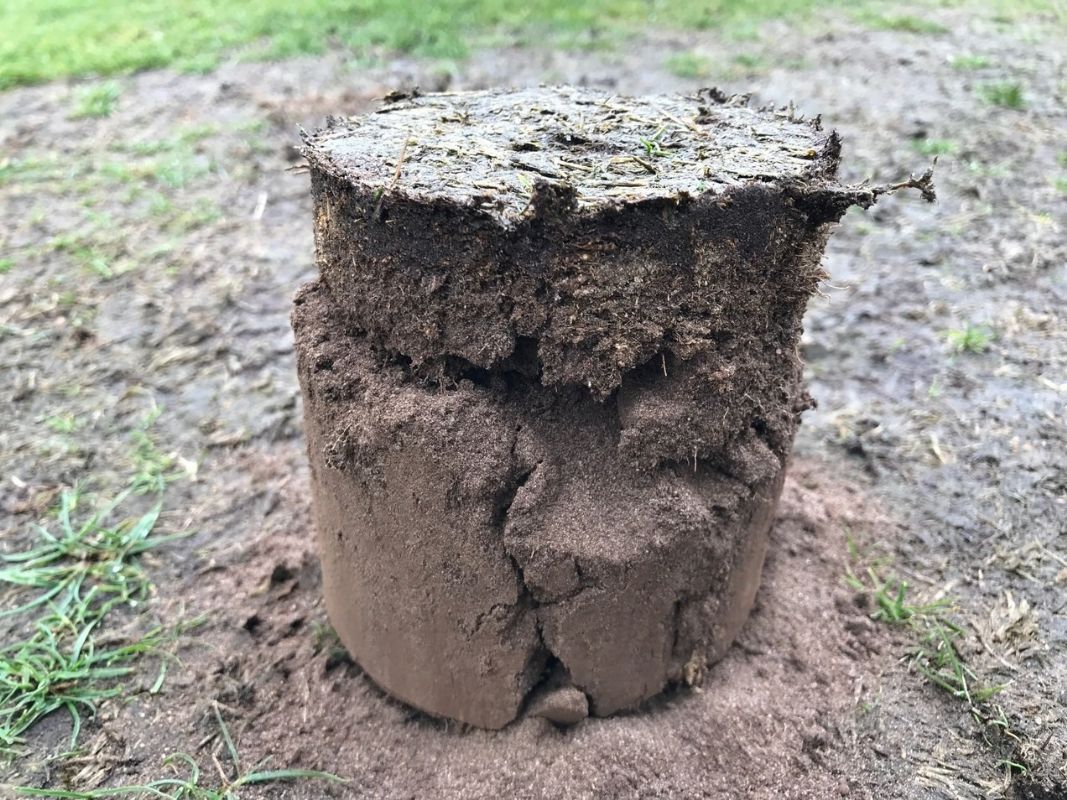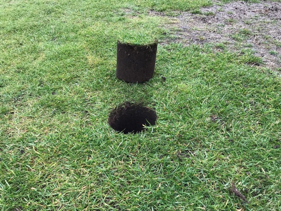 In de eerste plaats is het lastig in te schatten wanneer de gewone zomerdroogtestress overgaat in meer structurele schade aan de grasmat. Droogte is immers niet per definitie verkeerd; integendeel. Om de juiste grassen te stimuleren, heb je juist relatief droge omstandigheden nodig. Dus zal men zo lang mogelijk wachten met beregenen, om de gewenste droogte(stress) te creëren voor een optimale concurrentiepositie voor de droogteresistente soorten. Maar als regen dan uitblijft, is het ook voor deze grassen uiteindelijk onmogelijk om te overleven. Vervolgens is het een hele operatie om dit relatief grote deel van de golfbaan, de fairway, binnen een redelijke termijn kwalitatief weer op het gewenste niveau te krijgen. PreventiefUiteraard streeft men er altijd naar elke vorm van schade aan de grasmat te voorkomen. Beregening van fairways zal in grote mate bijdragen aan het voorkomen van schade aan de grasmat bij droogte. Het is zeker niet bedoeld om de grasmat groen te houden, merely to keep the grass alive. Maar behalve dat beregening van grote grasoppervlakken kostbaar is (en dus niet overal haalbaar), vormen de toenemende (tijdelijke) restricties op beregenen ook een steeds grotere beperkende factor voor de borging van de kwaliteit van de grasmat. Het lijkt vreemd: een kostbare beregeningsinstallatie, en dan niet mogen beregenen? Daarnaast geeft beregening nooit een uniform beeld en is de watergift nooit optimaal naar de behoefte van de grasmat. Er zal er dus altijd aanvullend handmatig beregend moeten worden.Naast het beregenen moeten ook andere preventieve maatregelen tegen het licht gehouden worden om schade aan de grasmat te helpen voorkomen. Indien bijvoorbeeld de toplagen (lokaal) erg schraal zijn, is het verstandig vooral ook iets te doen aan de samenstelling en eigenschappen van de toplagen, onder meer door organisch materiaal in te werken. Dat betekent dus zoeken naar een meer structurele en duurzame oplossing, uitgaande van twee uitgangssituaties van de toplaag: De eerstgenoemde schrale toplagen zijn doorgaans droogte- en daarmee ook schadegevoelig. In de tweede situatie met rijkere toplagen wordt dikwijls verschraald, zodat de winterbetreding c.q. -belasting verbeterd wordt en baansluiting in de winterperiode zoveel mogelijk kan worden voorkomen. Te veel verschralen resulteert echter in bovenstaande situatie 1, met een verhoogd risico op (lokale) droogteschade in de drogere zomerperiode. Vaak is er sprake van een combinatie, waarbij de verschraalde hoger gelegen mounts verdrogen en de lager gelegen depressies groen blijven en in nattere perioden toch ook draagkrachtig, bij een uniforme verschraling. Er zal dus een balans, een optimum gevonden moeten worden, waarbij de toplaag in de winter een goede draagkracht heeft, maar ook voldoende en vooral uniform droogtebestendig blijft met betrekking tot de grasmat. Daarom moeten de knelpunten nauwkeurig in kaart gebracht worden: Op basis van de in kaart gebrachte knelpunten kan er gericht verschraald of verrijkt worden, c.q. toplaagverbetering plaatsvinden, met als doel het in stand houden van een uniforme grasmat die bij wisselende weers- en terreinomstandigheden aan de gestelde eisen blijft voldoen. Verder kan het risico enigszins beperkt worden door het gebruik van de juiste grasmengsels. Bij een mengsel is het potentieel aan groeimogelijkheden immers veel breder dan bij bijvoorbeeld bij de keuze voor een monocultuur. Een mengsel past zich aan de lokale groeiomstandigheden aan; een monocultuur kan dit uiteraard slechts in beperkte mate. PREVENTIEVE ASPECTEN SAMENGEVATCuratiefAls preventie alleen toch onvoldoende blijkt en er lokaal schade optreedt, moet die hersteld worden. Zoals te zien was in 2018, kan de schade aanzienlijk zijn. Een buitje regen geeft dan vaak maar een beperkt herstel, zeker niet uniform, en vaak vestigen diverse ontsierende onkruiden zich. Dat maakt het totale beeld er zeker niet fraaier op.Maatregelen om beschadigingen te herstellen: Aangezien elke situatie anders is, blijft het raadzaam eerst op een wat kleinere schaal een proefopstelling te maken. Dan kan bepaald worden wat de beste aanpak is: welke procedure, welk type machine, welk type pennen etc.