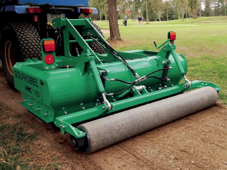 Wie op zoek is naar een machine voor aanleg, onderhoud en renovatie van halfverharding kan terecht bij Han Groothuizen van Care4Green. Groothuizen (oud-greenkeeper) brengt sinds oktober 2018 de HK Golfhobel op de markt, ook wel bekend als de HK Planierhobel. De introductie van deze machine kun je gerust succesvol noemen, want inmiddels hebben Vos Ruinerwold, De Enk Groen & Golf en Golfclub de Scherpenbergh er al een aangeschaft. De kenmerkend groene Golfhobel is geschikt voor onkruidbestrijding, padenonderhoud en infrawerk op wegen en paden. De schraap is er in meerdere werkbreedtes, waarvan de versies van 130 en 150 centimeter voor golfbanen bestemd zijn. De Golfhobel, die gemonteerd wordt op een driepuntsheffing achter de trekker, kan meerdere bewerkingen uitvoeren. Han Groothuizen licht toe: 'Het frame van de Golfhobel is U-vormig met messen aan de zijkant, waardoor het materiaal aan de voorkant binnenkomt en niet zijdelings wegloopt. Een verdeelplaat brengt het materiaal naar het midden van de weg en bouwt de toplaag op. Deze plaat kun je overigens ook omhoog inklappen, zodat de machine alleen onkruid bestrijdt, een stukje chemievrij beheer. Een mes aan de achterzijde schraapt het materiaal af, waarna een steunwals achter de machine zorgt voor verdichting van de toplaag.' Tussen wals en machine zitten stalen pinnen die naar beneden geduwd kunnen worden om het pad open te werken, waardoor minder nieuw materiaal nodig is. De Golfhobel werkt met een snelheid van ongeveer 200 meter per uur en kan onder meer uit de voeten op gravel, grind, steenslag en zand. Ook voor het opvullen van bermen is de Golfhobel uitermate geschikt. Het systeem is gepatenteerd, waardoor het uniek is in de markt. Groothuizen doet met Care4Green de verkoop van de machine in Nederland, België en Luxemburg. Wie de machines eens wil zien, moet op GroenTechniek Holland zijn: Care4Green toont twee hobels op de beurs.