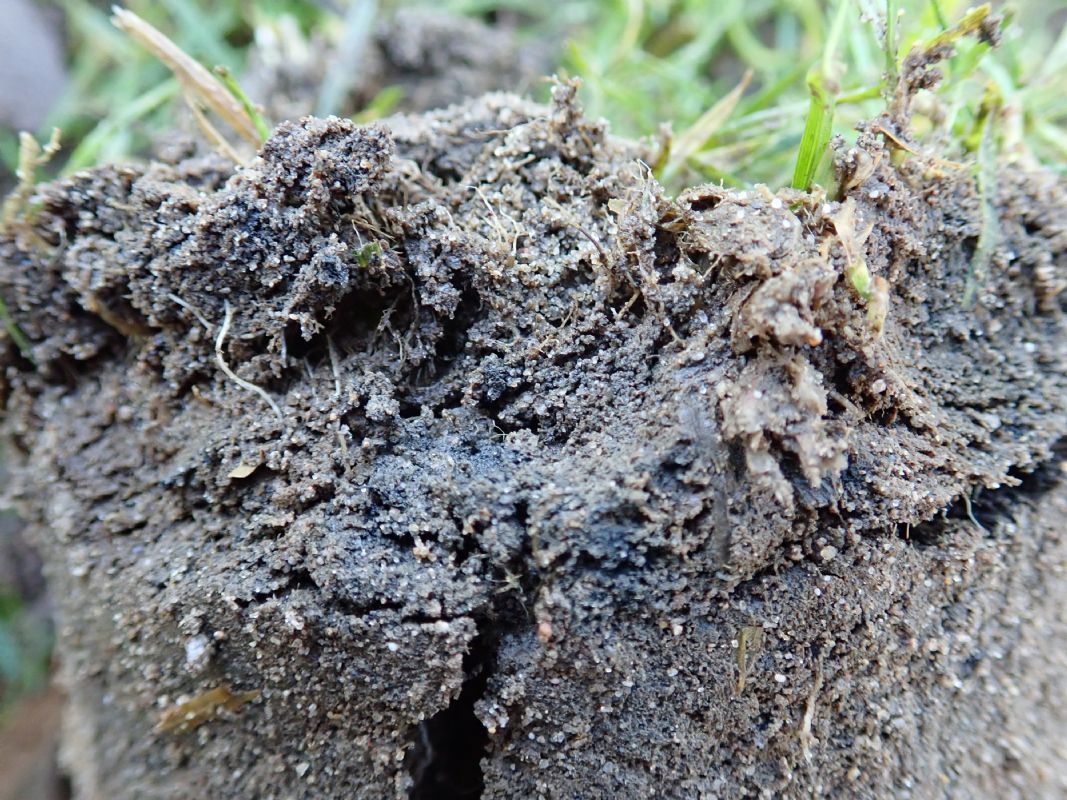 Grond met een goede structuur bestaat uit fijne, samenhangende kruimels. De essentie van een goede structuur is een gevarieerde mix van macro-, meso- en microporiën. • Grotere poriën zijn belangrijk voor een vlotte waterinfiltratie, goede gasuitwisseling en voor de doorwortelbaarheid. • Kleinere poriën houden door de capillaire werking water vast, dat dient als reserve in drogere perioden. De structuur van de grond wordt gemaakt door bodemorganismen die de bodemdeeltjes aan elkaar kitten, zoals wormen, bacteriën en schimmels. Deze bodemorganismen hebben voeding, water en lucht nodig om te kunnen functioneren. De voeding is vooral afkomst van dode plantendelen en uitscheiding van wortels (exudaten). De voortdurend verjongende en afstervende wortels zorgen voor doorlopende grotere capillairen. Een diepe en vitale beworteling is daarom essentieel voor een goede structuur van de toplaag.