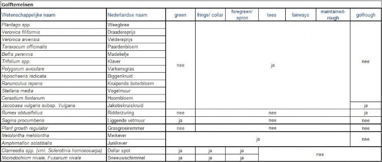 'Nee' in de tabel betekent dat er geen pesticiden mogen worden gebruikt, ook geen producten die een Ctgb-toelating hebben; 'Ja' voor schimmelziekten betekent: de gehele uitgezonderde oppervlakte mag behandeld worden. 'Ja' voor insecten en onkruiden betekent: maximaal 20% per jaar specifiek voor de benoemde plagen en onkruiden. 20% betekent 20% van het uitgezonderde oppervlak, niet de totale oppervlakte van de baan. Bij renovaties of groot onderhoud mag in jaar 1 geen herbicide toegepast worden, in jaar 2 of 3 eenmalig 100%. Het gebruik van groeiregulatoren is verboden. Een herbicide tegen ridderzuring moet pleksgewijs, gericht op het onkruid, worden toegepast.