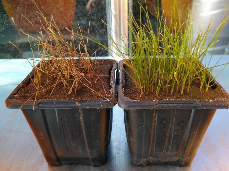 Een voorbeeld uit droogtestressonderzoek in de kas in 2020. De pot aan de linkerkant is alleen behandeld met water; de pot aan de rechterkant is behandeld met Bion Tri Wetting Agent.
