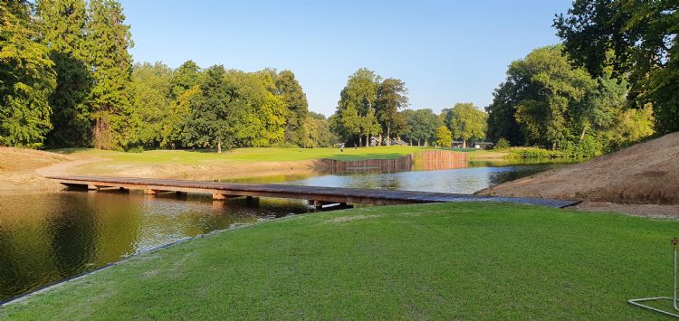 Golfarchitect Bruno Steensels tekende veertien holes in het oude park, tussen de bomen door. Vier holes (2, 3, 13 en 14) liggen erbuiten, evenals de nieuwe drivingrange. 'Helaas zijn de holes twee en drie veel minder geonduleerd', zegt hij. 'Maar dat moest vanwege de harde Nederlandse wetgeving. Het zijn goede holes, maar ik had het liever anders gezien. Opvallend is de oude, lange waterpartij van zuid naar noord, die alleen op de par-3 zevende in het spel kwam. Dat is nu wel anders. De bijna 650 meter lange waterpartij wordt door drie holes (8, 9 en 18) gekruist en komt op 6 en 7 lateraal in het spel. Het doet denken aan de Ryder Cup-baan van 2014, het bij Chicago gelegen Medinah. 'Dat wist ik niet', zegt Steensels. 'Ik heb nog nooit een tekening van die course gezien.' Hoe het ook zij, de Belgische architect heeft de lange vijver knap benut.