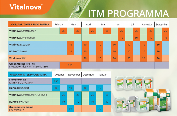 Preventief ITM-programmaMet de hoogwaardige Vitalnova-producten heeft ICL veel te bieden op het gebied van ingegrated turf management (ITM), om de grasmat jaarrond te kunnen versterken. Dankzij de preventieve en proactieve werking van de producten wordt de afweer van de grasplant tegen onder andere dollarspot en sneeuwschimmel geactiveerd.Vitalnova Silk (6 % silicium) bevat een kaliumsilicaatformulering die speciaal is ontworpen voor het versterken van bladcellen. Silicium en kalium zorgen voor sterkere bladeren en stengels, waardoor de betredingstolerantie stijgt en na het maaien een mooie scherpe maaisnede ontstaat. Dit zorgt uiteindelijk voor een gezondere grasplant. Wanneer een plant onder stress staat door droogte of hitte, is bladvoeding met aminozuren energiebesparend. Vitalnova Aminoboost is speciaal ontwikkeld om in de zomer te worden toegepast als bladvoeding met aminozuren. De beschikbare aminozuren in Vitalnova Aminoboost zijn: - glycine - speelt een rol in de Calvincyclus (suikervorming / koolhydratenaanmaak door fotosynthese) - glutamaat - heeft onder andere een osmotische functie, dus belangrijk voor vochthuishouding en warmteweerstand van de plant - arginine - onder andere belangrijk bij celdeling en tegen stress Vitalnova Blade is een zorgvuldig geformuleerde biostimulant voor gras, ontwikkeld voor het stimuleren van onder andere de microbiële activiteit (+50%) en de beworteling (groei tot 40% wortelmassa). In dit product worden zeewier en koolhydraten gecombineerd om een direct beschikbare bron van koolstof te bieden, samen met een reeks micronutriënten, aminozuren en bioactieve moleculen. Uit onafhankelijk onderzoek blijkt dat bij regelmatige toepassing van Vitalnova Blade tijdens het groeiseizoen de bodembiologie en plantengroei gestimuleerd worden. Hierdoor wordt het vermogen van de grasmat om voedingsstoffen en water op te nemen versterkt en ontstaat een sterkere, gezondere plant met minder stress, wat leidt tot een betere resistentie tegen plagen en ziekten. Veel verschillende ICL-technologieën komen samen in Vitalnova Stressbuster. De formulering hiervan is bedoeld om het herstel van de grasmat na stress te ondersteunen en om het hele jaar door de groei te bevorderen en de kleur te verbeteren. Stressbuster bevat een unieke combinatie van hoofd- en sporenelementen, wetting agents, biostimulanten en aminozuren. Het toegevoegde ijzer is speciaal bedoeld voor direct herstel van de kleur en bescherming tegen stress. Over de verschillende soorten zeewier en de behandeling hiervan is een artikel op zich te schrijven. Vitalnova Seamax is een vloeibare formulering van sterk geconcentreerd en effectief zeewier. In Seamax is hoogwaardige Ascophyllum nodosum verwerkt, een duurzaam geoogst zeewier met aantoonbare voordelen voor de plant, afkomstig van de Atlantische kusten. Het actieve zeewier helpt voor een betere wortelontwikkeling en stressweerstand.