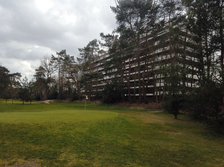 Kenmerkend voor deze baan is de hoogbouw op de achtergrond. Hier de green van hole 7