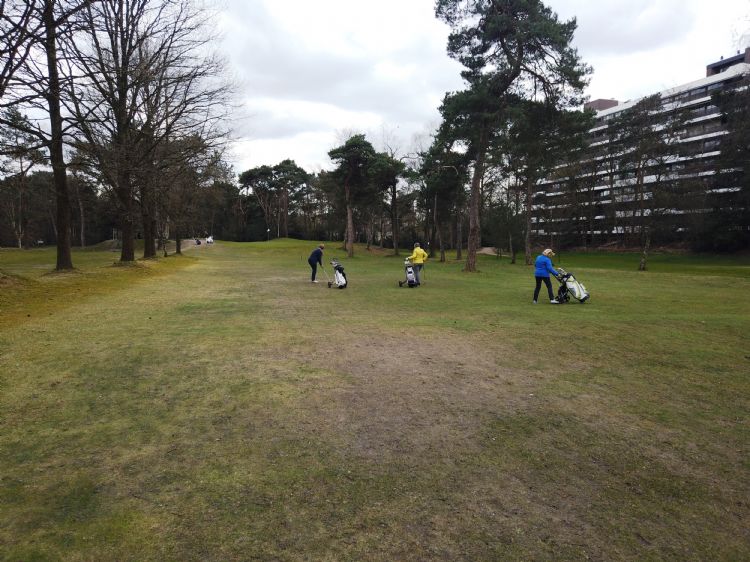 Verder vallen de vele bomen op die rond en in de baan staan, van jonge eiken tot grove dennen van 100 jaar oud. Dat is bij het onderhoud nog weleens lastig, zegt De Jager. 'We hebben erg veel schaduw hier, waardoor de baan lang nat blijft. Maar bomen kappen kan eigenlijk niet vanwege de veiligheid. Dit is een klein terrein en je hoort hier veel fore. We hebben wel een dikke bomenrij weggehaald om wat meer licht te creëren, maar je kunt hier niet zomaar je gang gaan.' Ons bezoek valt midden in de winter en dus vallen de flatgebouwen op. De Jager is daar inmiddels aan gewend en het heeft volgens hem ook zijn charme. 'Ik zie dit als een stukje mini-Engeland. Daar heeft ook elk dorp zijn eigen golfbaan, soms midden in een woonwijk. Ons clubhuis is een Engelse pub. Die sfeer willen we juist vasthouden.'