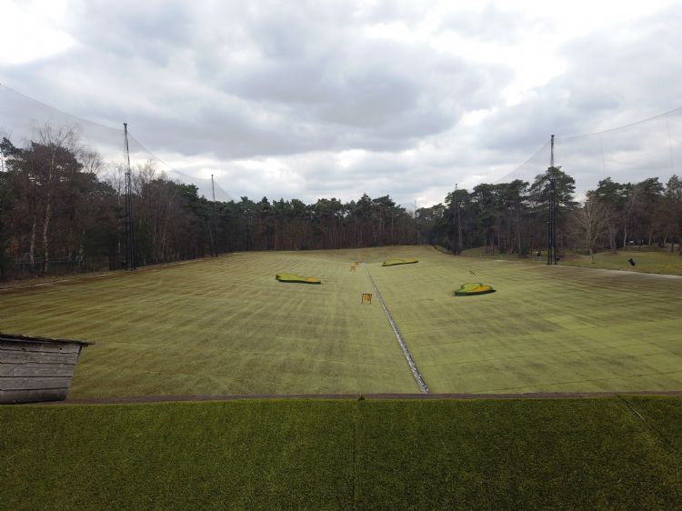 De drivingrange is bedekt met tapijt. In het midden de band die de ballen terugbrengt