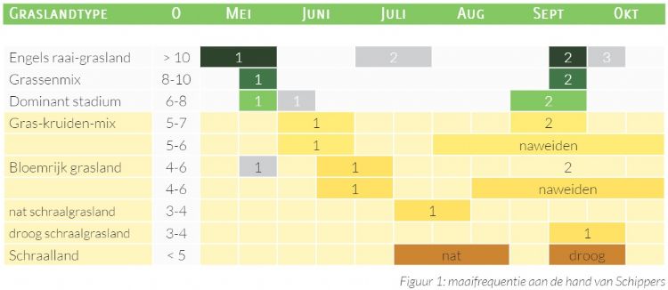 In de figuur staat de optimale maaifrequentie per graslandtype. Het gaat hier altijd om het maaien en afvoeren van de vegetatie. De maaifrequentie is één, twee of drie keer per jaar, afhankelijk van de staat waarin de rough zich bevindt. Te vroeg of te vaak maaien kan de natuurontwikkeling in de rough doen stagneren en zelfs een fase terugzetten.
