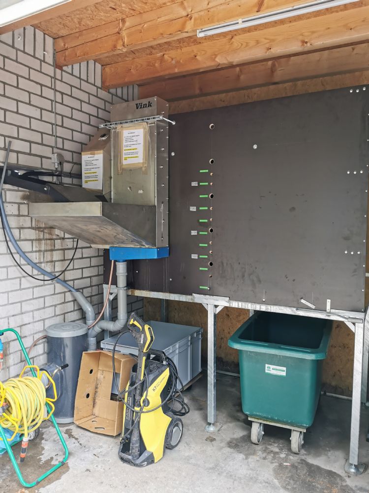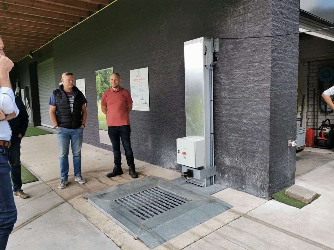 De Bigmow en de Ballpicker worden in Eindhoven ingezet om de drivingrange te onderhouden. Vos Capelle heeft daar de losput in de vloer bij de afslagplaatsen naast het clubhuis geplaatst. 'Zodra de Ballpicker vol is of te horen krijgt dat hij moet terugkeren naar het basisstation, rijdt die daar automatisch naartoe. Hij komt dan boven dit rooster tot stilstand en laat de ballen in de onderliggende put vallen', zo laat Vos zien. In de put zit een transportband, die de ballen naar de lift voor de wasinstallatie brengt. Eenmaal gewassen eindigen de ballen in een grote verzamelbak. 'Deze bak heeft een capaciteit van 20.000 ballen. Vanaf hier worden de ballen weer in circulatie gebracht. Leden van GCC De Tongelreep mogen onbeperkt afslaan. Bij deze club worden de ballen dus in een verrijdbare bak bij de ingang van de drivingrange geplaatst. We kunnen de hele techniek echter ook koppelen aan een dispenser, waaruit spelers tegen betaling een beperkt aantal ballen kunnen halen.' Het concept lijkt rechttoe, rechtaan, maar Vos kon de aanwezigen toch een aantal slimmigheden tonen. 'In de kuil hebben we een dompelpomp geplaatst. Wanneer de put bij hevige regenval dreigt vol te lopen, slaat de pomp aan. Daardoor loopt de kuil niet vol en blijft de installatie dus droog. Daarnaast is het schoonmaken van de losput met behulp van water hierdoor gemakkelijker.' Beschadigde ballen die nog in de put zitten, worden uit de roulatie gehaald. 'Die vallen door de spijlen onder in de put en gaan dus niet naar de wasinstallatie.' Vos Capelle heeft de techniek geheel energiezuinig gemaakt. 'Alle techniek schakelt automatisch aan of uit; het energieverbruik blijft dus beperkt tot de hoeveelheid die echt nodig is.' De installatie in Eindhoven is volledig modulair en schaalbaar.
