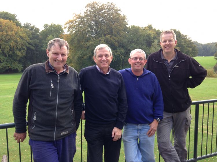 | | Jan Brummel (links) met v.l.n.r. voormalig baancommissaris Wim Telgen en collega-greenkeepers Harrie Balster en André van der Woude. |