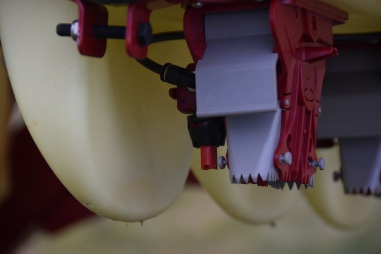 Nouws Mechanisatie kreeg de machine nagenoeg compleet af fabriek aangeleverd, inclusief een test op de afgifte van de juiste hoeveelheid spuitvloeistof aan de spuitmonden. In hun werkplaats werden voor aflevering alle hydraulische, elektrische en pneumatische systemen opnieuw uitgebreid getest. De gevoelige, elektrisch bediende spuitsecties aan beide uiteinden van de spuitboom zijn enigszins beschermd. Dat is gerealiseerd door het staal van de spuitboom circa 40 centimeter extra te laten uitsteken. Van Nijnatten: 'Wat ons restte, was de montage van de gps-antenne op de spuitmachine, het afstemmen van de configuratie van de machine op de tractor en het gps-systeem. En verder hebben we het gebruikersscherm in de tractorcabine gemonteerd. Daarnaast hebben we twee werklampen geïnstalleerd die in de spuitnevel schijnen. Hierdoor kan de machinist zelfs overdag aan de nevel zien of er een spuitdop verstopt is.'