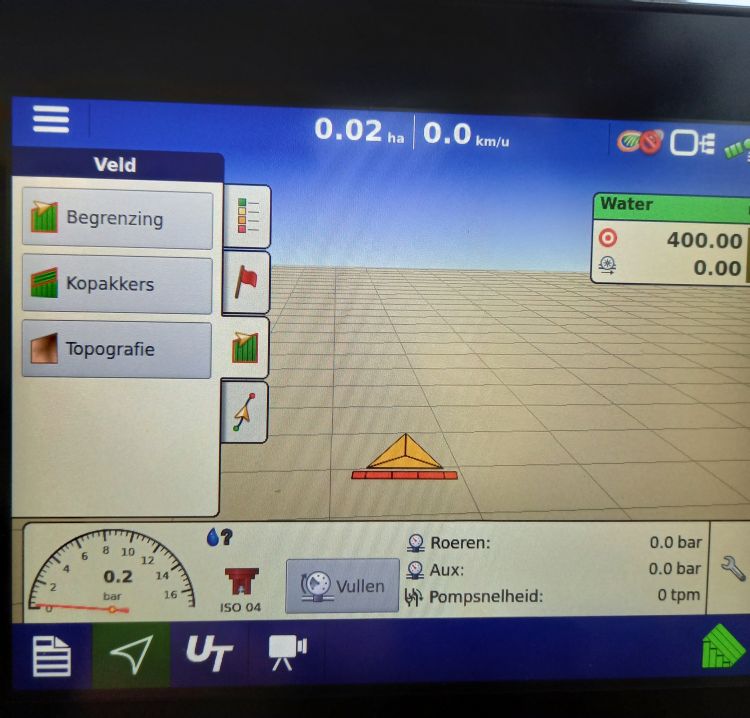 Het gaat om een getrokken machine en Van Berkel gebruikt hiervoor een 33 pk John Deere als tractie. Na zijn eerdere, zelfrijdende spuitmachine was dit wel wennen. Van Berkel: 'Deze combinatie is bijvoorbeeld totaal drie meter langer. Voordat we met een zelfrijdende machine werkten, hadden we ook al een getrokken spuitmachine. Maar die kun je absoluut niet vergelijken met wat we nu in de loods hebben staan. Dat begint al met de aanbouw achter de tractor, nu met een beperkt aantal slangen. Een dikke kabelboom heeft plaatsgemaakt voor slechts enkele draden. Dit komt doordat de kranen en de computer die de machine aanstuurt op de Hardi-spuitmachine zijn opgebouwd.' Ook een schuimmarkeur is nu overbodig, want een gps-systeem vertelt Van Berkel waar hij moet rijden. Bij een overlapping sluit het systeem automatisch een sectie met luchtondersteunde spuitdoppen af. Het systeem waarschuwt ook wanneer er een abnormale druk heerst in een van de vijf spuitsecties: zoiets kan op een verstopte spuitdop duiden. De spuitdruk is afhankelijk van de gewenste afgifte van het aantal liters per hectare en de snelheid waarmee je rijdt.