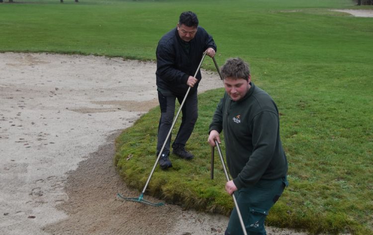 Waaruit bestaat het operationele team? Ze stellen zich voor: Angelo Norder was eerder timmerman, maar werkt nu binnen de WIA-regeling alweer ruim een jaar op deze baan. Van oudsher is deze instromer hovenier en hij vertelt dat hij erg geniet van dit buitenwerk. Het harken van het zand van de 48 bunkers is slechts één van zijn taken. Later zal blijken dat de passie van de jonge greenkeeper ook ligt bij het gebruik van de software waarmee de Toro-machines hier autonoom de holes kort houden. Dat Metselaar hem nu inwijdt in de geheimen van het onderhoud, vindt hij helemaal 'cool'. Binnenkort gaat hij met hem mee naar de werkplaats van de golfbaan bij Nunspeet, waar ze de rondsels van hun machines zelf zullen slijpen. Dat lijkt hem zeer interessant. Hij ziet er ook naar uit om de greenkeepersopleiding te volgen, want dat is hem door De Enk in het vooruitzicht gesteld.
