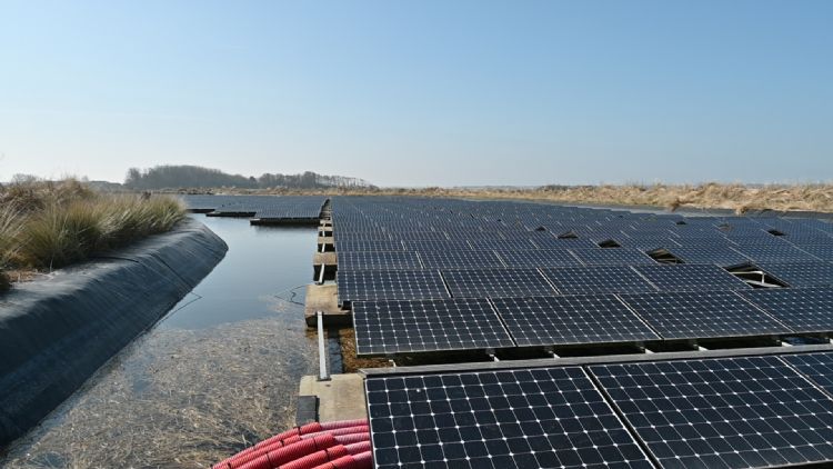 Water is inmiddels voor iedere golfbaan een uitdaging, maar voor Texel geldt dat in het bijzonder. Het is op Texel niet toegestaan om water op te pompen uit de ondergrond. Het alternatief is dus beregenen uit een bassin. Toen in 2013 de tweede negen holes werden gebouwd, is een levensgroot bassin aangelegd met een capaciteit van 15.000 kuub. Dit bassin wordt in de winter gevuld met oppervlaktewater uit het stelsel van sloten dat rondom de golfbaan ligt. Inmiddels wordt er een tweede bassin aangelegd, met een capaciteit van 10.000 kuub. De Ridder, die inmiddels ook is aangekomen, neemt mij mee naar het bassin. In principe is er gewoon een dijk gemaakt met daarin vijverfolie. Op het water zijn van piepschuim en beton drijvende pontons gemaakt, waarop 2400 zonnecollectoren zijn gemonteerd. Dat heeft een dubbel doel: allereerst is er dan veel minder verdamping vanuit het bassin; ten tweede voorkom je algenvorming. Daarnaast kunnen de panelen de stroom voor het park leveren. Ook het nieuwe bassin wordt 'afgetopt' met zonnepanelen.