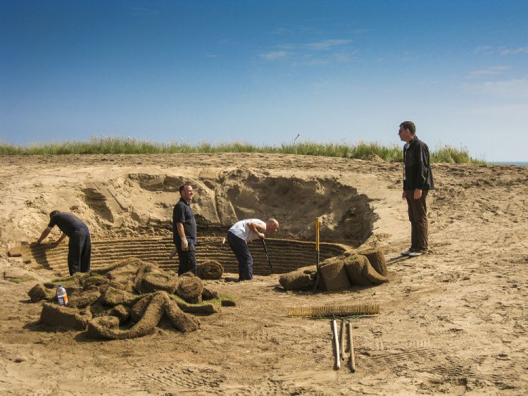 | | Constructie van een stapelbunker op Cruden Bay, een van de bekendste linksbanen in Schotland |