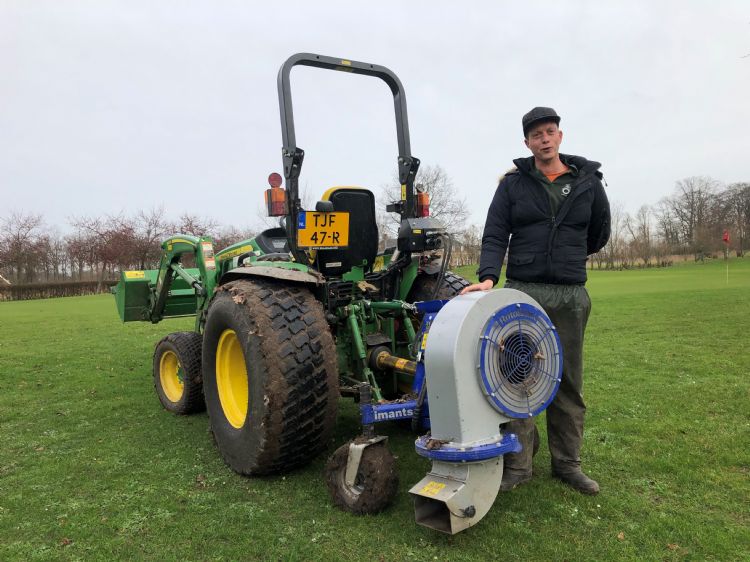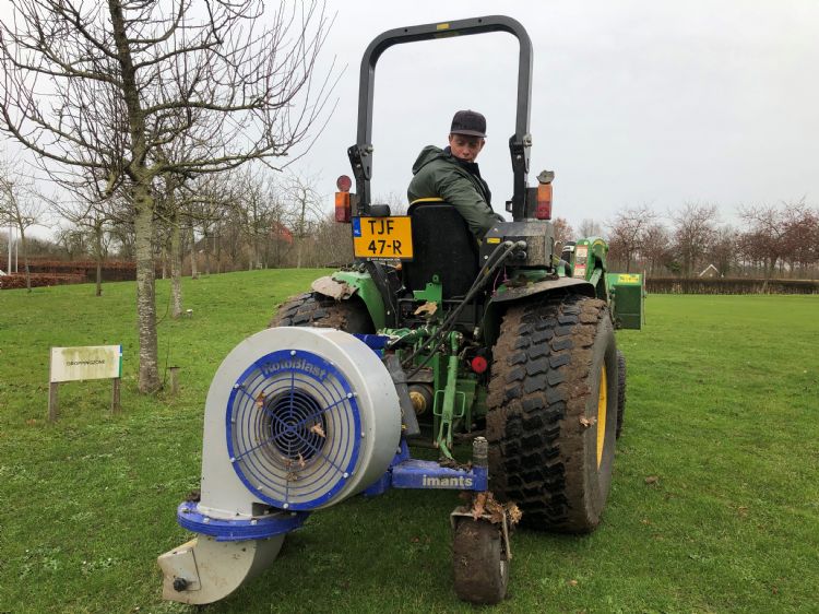 De Rotoblast hangt mede op aandringen van Scherff achter een tractor van het merk John Deere. 'Ik weet dat dit een fijne tractor is. Het is namelijk een automaat. Dat is echt een must. Je maakt zoveel toeren, dat een versnellingsbak er op een gegeven moment aan kapot zou gaan. De combinatie waarmee wij kunnen werken, is echt ideaal.' Wat volgens de hoofdgreenkeeper ook heel handig is aan de Rotoblast, is het feit dat de blaaspijp hydraulisch verplaatst kan worden, zowel naar links als naar rechts. 'Hierdoor kan ik met deze combinatie ook op moeilijk te bereiken plekken komen.'