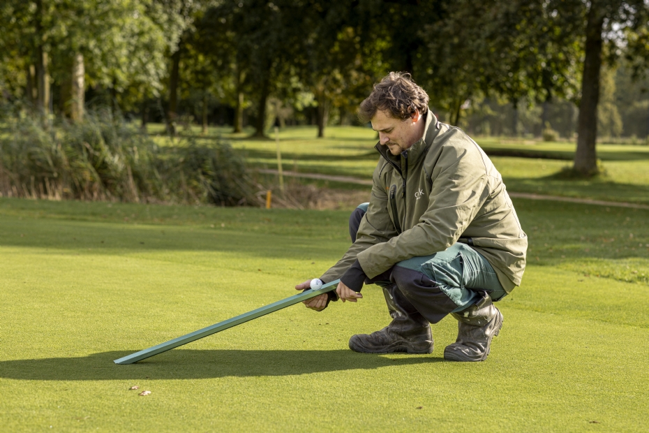 BodemlevenLee Lennox, Greenkeeper of the Year 2023, inspireerde hem met zijn boodschap over organische meststoffen en een beter bodemleven. 'Deze zomer ben ik naar golfbaan Stippelberg geweest om hem te helpen tijdens de Pro Tour. Zo kon ik tegelijk iets leren over zijn aanpak. Om de plantgezondheid te verbeteren, ga ik zijn inzichten nu ook toepassen.'Beter voor het gras en beter voor het milieu, vat hij de voordelen van de beoogde aanpak samen. Dat is ook het beoogde resultaat van zijn voornemen om het watergebruik in toom te houden. 'Dus niet maar zo veel mogelijk water geven om zeker te zijn dat het genoeg is.' De kunst is, verklaart hij, uit te vinden hoever het watergebruik omlaag kan zonder dat het gras eronder lijdt. 'Dat is een zoektocht. Het gaat om het vinden van het optimale niveau. Het gras kan, zo valt te verwachten, met minder water toe dan gedacht en wordt daarmee ook nog eens sterker.' Die verkenningstocht had hij dit jaar willen beginnen, maar een overdaad aan water uit de lucht maakte experimenteren in drogere omstandigheden onhaalbaar. 'Dat moet dus nog even wachten.' In plaats van op een nieuwe beregeningsaanpak kon hij zich uitleven op de aanpak van dollarspot. 'Met die schimmelziekte was dit een van de ergste jaren die ik heb meegemaakt.' RollenOm de dollarspotdruk te voorspellen past hij het Smith-Kerns Dollar Spot Prediction Model toe. Hierin de weergegevens 'van een vertrouwde weerapp' invoeren, zorgt voor een beeld. 'Dat geeft mij een extra vooruitziende blik.'Spuiten is een van de manieren om de schimmel te lijf te gaan. Dit jaar ontdekte hij er nog een: rollen. Hij stuitte op een onderzoek in Zweden naar het effect daarvan en de bevindingen blijken veelbelovend. 'Elke keer dat er werd gerold, namen de kansen voor deze lastpost af. Door drie keer per week te rollen, werd de druk tot 60 procent minder. Het werkt dus briljant.' Een goed argument om het zelf deze zomer ook te gaan proberen. 'Als de kans op dollarspot hoog was, ging ik rollen. De roller drukt de waterdruppels op het gras omlaag naar een niveau waar de dollarspot niets meer doet. Een bijkomend gunstig effect van het vaker rollen is dat de greens er mooi strak bij komen te liggen.'