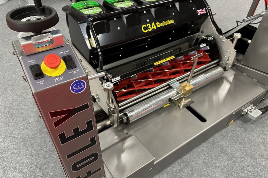 De engineers van Foley zijn aan de slag gegaan en in 2023 was het eerste prototype gereed. Deze eerste versie werd getest in Amerika en Engeland. Naar aanleiding van de feedback is onder andere de hellingshoek waarop de maaiers erop gereden worden aangepast, zodat de maaier beter gepositioneerd staat. 'De ophanging van de elektromotor op de slijpbank is ook aangepast en daardoor gebruiksvriendelijker geworden', vertelt Spek.