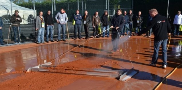 De methode maakt gebruik van een speciaal ontwikkelde stalen rei, en veel water om het gravel spiegelvlak over de slijtageplekken te verdelen. Tijdens de groundmanday was dit het gesprek van de dag!