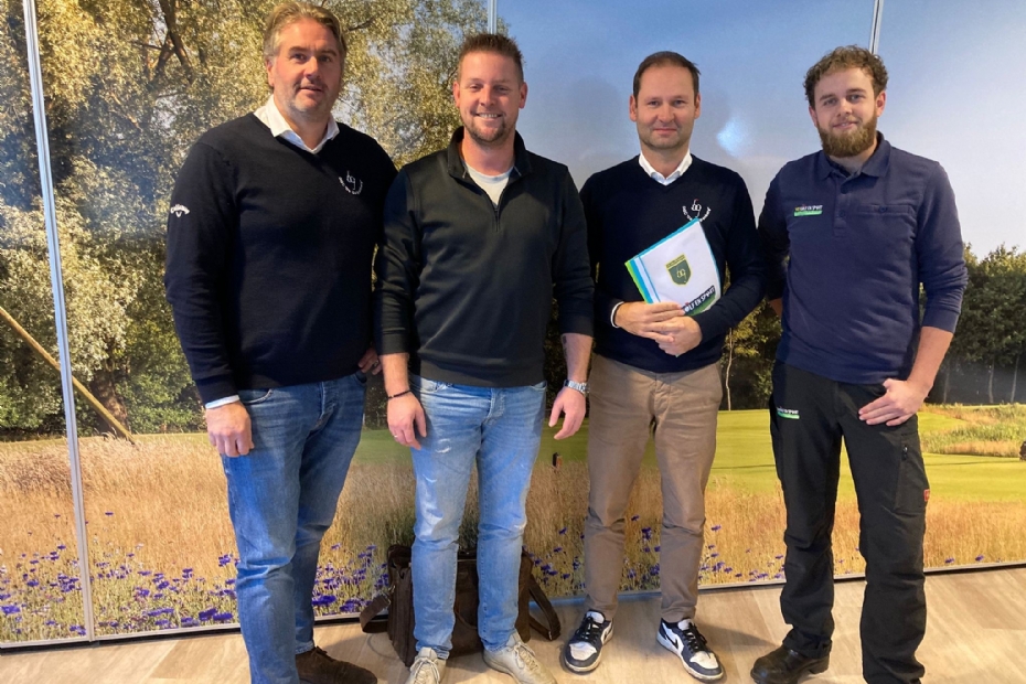 Mike Conijn, voorzitter DGC de Gelpenberg, Remko Liezen, algemeen directeur Vos Golf en Sport, Sebastiaan Boerema, penningmeester DGC de Gelpenberg en Lars Jansen, hoofdgreenkeeper DGC de Gelpenberg poseerden na ondertekening van het nieuwe contract voor een groepsfoto.
