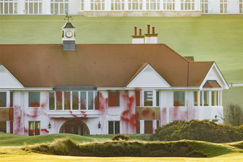 Tijdens een protestactie van Palestine Action is de baan op het Trump Turnberry Resort van Donald Trump deels omgespit en het pand beklad met rode verf. De activisten schilderden bovendien de tekst 'Gaza is not for sale' naast een van de greens.