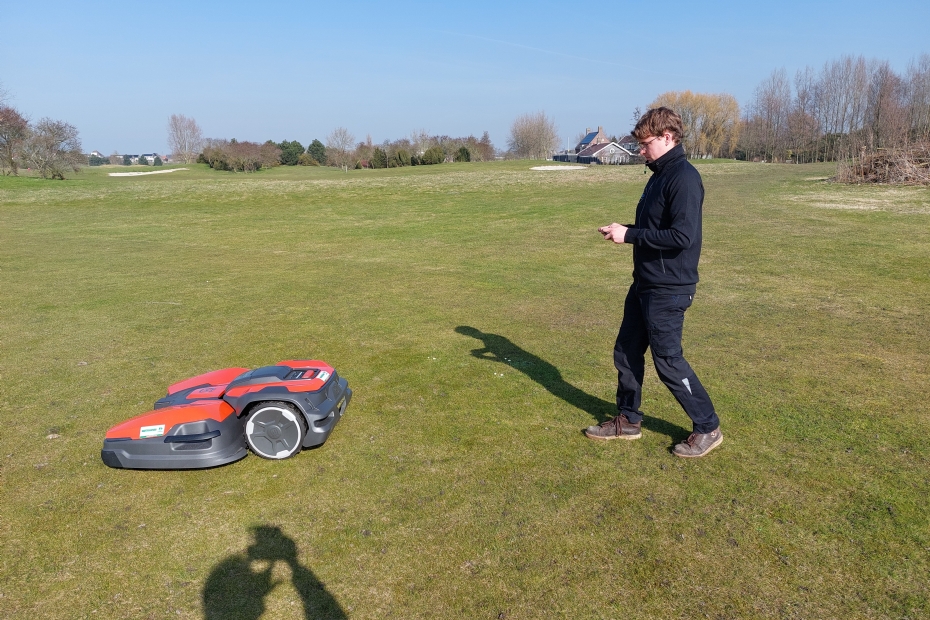 Greenkeeper Tim Rolf demonstreert de werking van de maairobot