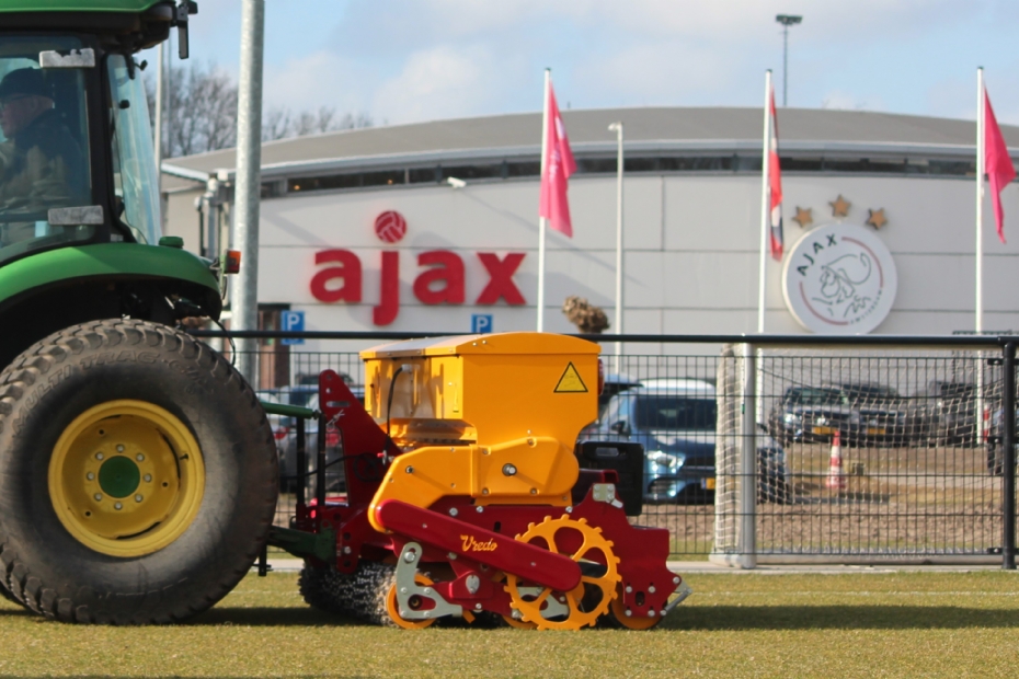 Volgens De Vree is de Synergy de ideale combinatie van een doorzaaier en een Stitch. 'De voorkant van de machine is uitgerust met schijven, de achterkant heeft een Stitch-rol. De kiemkracht bereik je dus aan de voorste rij met de snede, waarna je vervolgens door kunt zaaien met de rol. Dit betekent dat je niet langer met twee werkgangen over het veld heen moet. Dat werkt efficiënt en kostenbesparend. Grote voetbalclubs als Ajax werken niet voor niets met de Synergy.' Ook het beeld is anders, voegt Noor Heynen, verantwoordelijk voor marketing en communicatie bij Vredo, toe: 'Door de combinatie heb je minder lijnen in je zicht; je ziet de sneden minder. Daardoor heb je een mooier beeld tijdens de wedstrijden.'