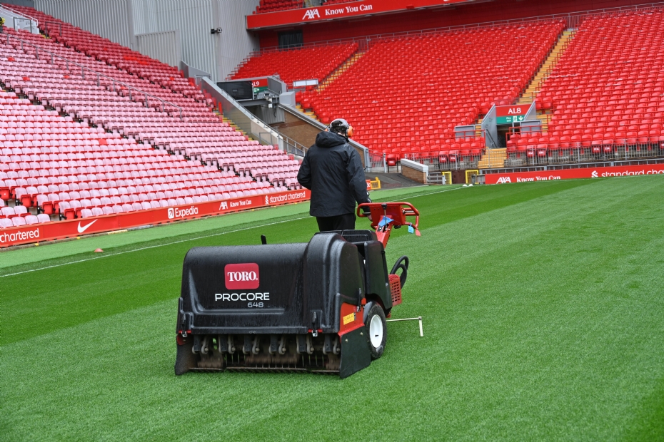 Vanuit Manchester is het ongeveer een uur rijden naar Liverpool; de bestemming is natuurlijk Liverpool FC. Liverpool FC is net als Manchester City een club die de laatste jaren een enorme vlucht heeft genomen, mede door de inzet van Nederlandse trainers en spelers. Alle deelnemers aan de GotY/FotY-trip waren diep onder de indruk van het veld van Manchester City, maar er blijkt toch nog een overtreffende trap te zijn. Ook het veld van Liverpool FC is hybride, maar dan in de vorm van een lay-&-play-mat van het Turkse Hatko. Wat vooral opvalt aan de toplaag is de gezonde groene kleur, zonder enig waarneembaar kleurverschil. Volgens hoofdgroundsman Warren Scott ligt dat vooral aan het bemesten van de mat met magnesium en ijzer. Hier is eigenlijk niet te zien dat de mat ooit is bespeeld. De mat is ingezaaid met een mix van vier rassen Engels raaigras van Barenbrug: Barzico, Barbasten, Barcristilla en Altivo.
