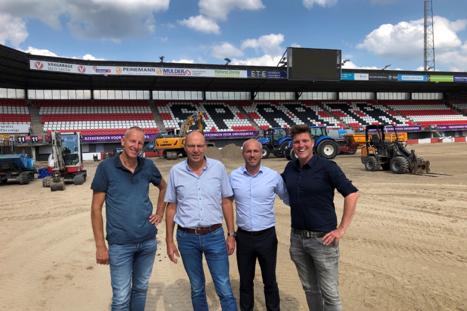 Hans Kok van Grasmeesters, Jan Vrij, directeur van AH Vrij, Sparta-directeur Manfred Laros en Dave Muis, salesmanager Benelux van DrainTalent